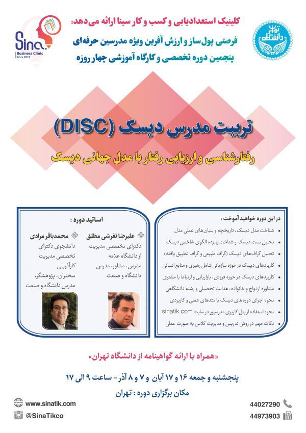 ⚜ کلینیک استعدادیابی و کسب و کار سینا، بنا به درخواست علاقمندان مبحث رفتارشناسی با مدل جهانی دیسک و رضایت شرکت کنندگان چهار دوره قبلی به منظور توسعه دانش رفتارشناسی در جامعه، پنجمین دوره تربیت مدرس دیسک (DISC) را به شرح ذیل در فصل پاییز، سال ۱۳۹۸ برگزار مینماید.